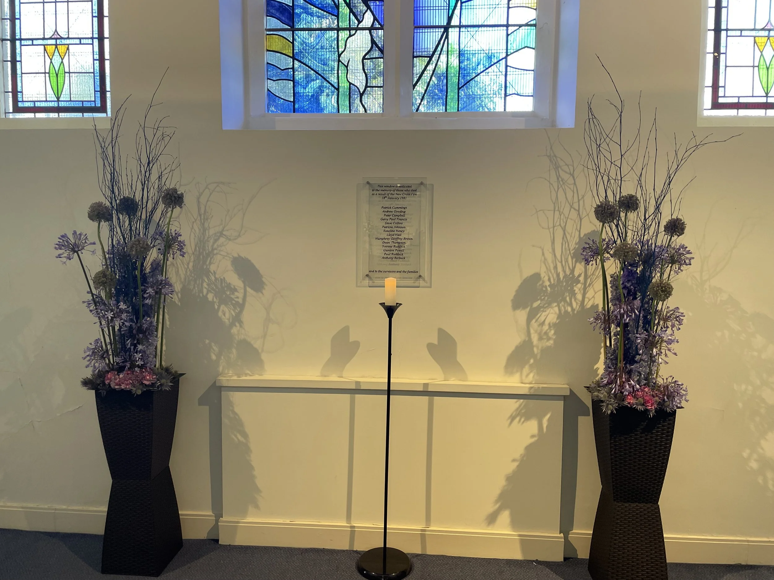 The New Cross Fire Memorial Window was designed by stained glass artist Nicola Hopwood and installed here in 2002.